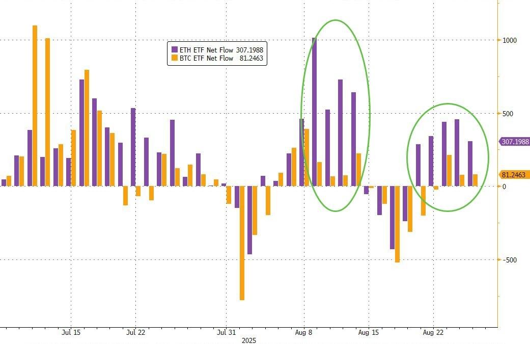 现货以太坊ETF在美国交易火爆,过去五个交易日吸引的资金流入量是现货比特币ETF的十倍以上。根据CoinGlass数据,自8月21日以来,现货以太坊ETF已录得高达18.3亿美元的资金流入,而比特币ETF同期仅有1.71亿美元,仅为以太坊的不足1/10。