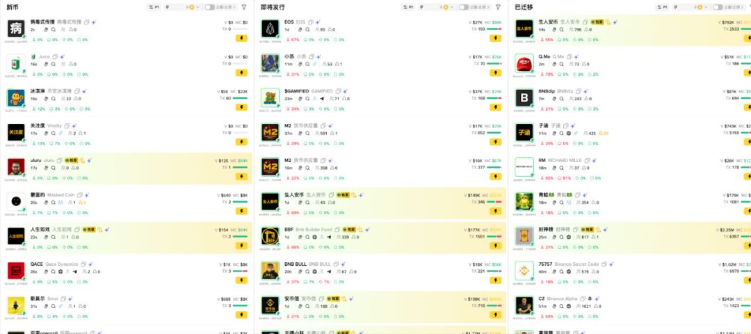 那么,我们该如何利用 Meme Rush 来寻找和参与早期的Meme项目呢?其界面通常分为三个核心区域,代表了项目的不同阶段:新币、即将发行、已迁移。