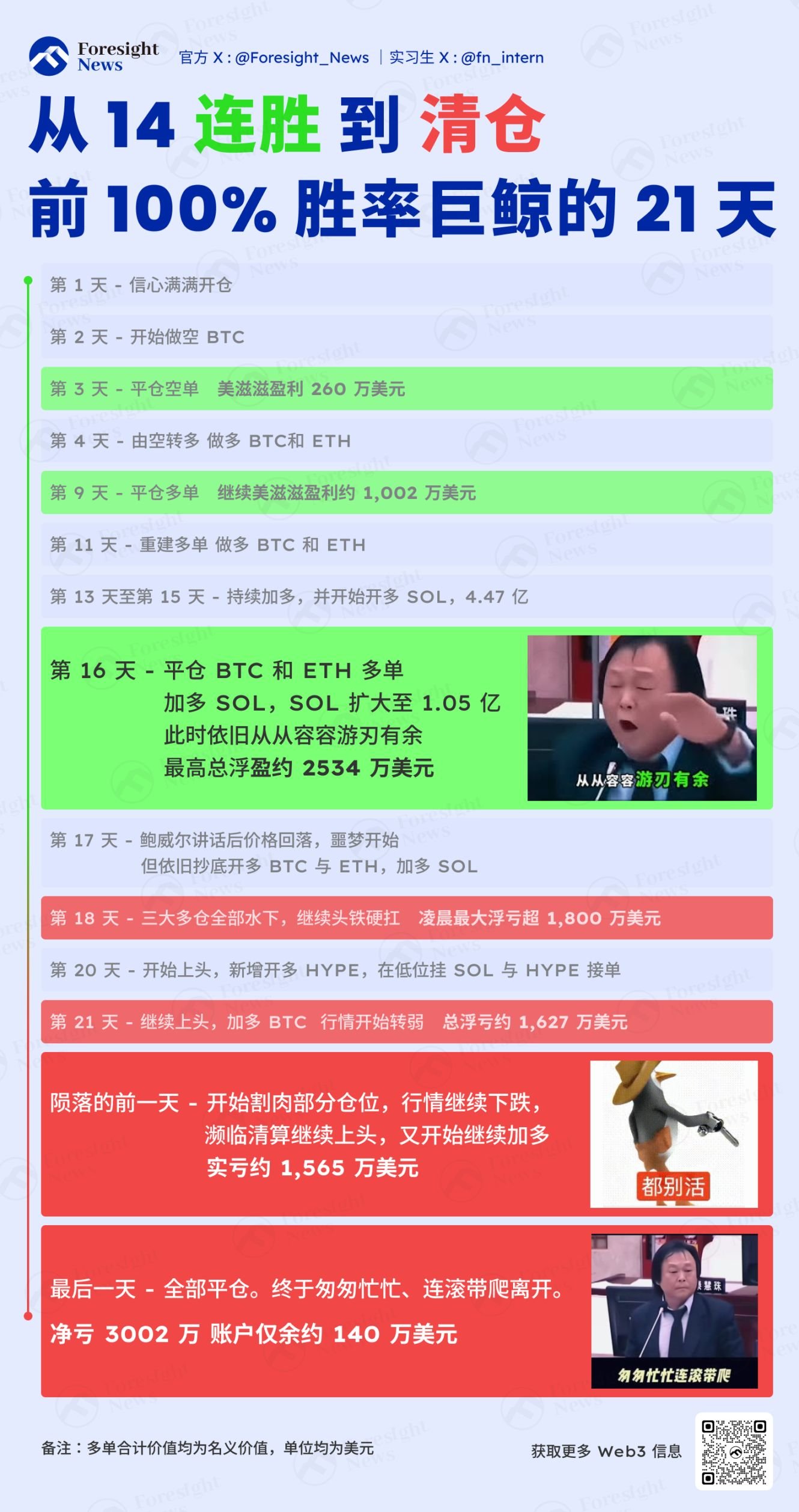 Hyperliquid 的交易记录里,几乎每一个传奇都以相似的方式终结:James Wynn 曾在 20 倍杠杆下持有 12 亿美元 BTC 多单,巅峰盈利 8700 万,最终倒亏 2177 万;qwatio 用 300 万本金无限滚仓,一度赚下 2600 万,结局归零;老牌交易员 AguilaTrades 30 万本金最高盈利 4170 万,最终亏损 3760 万。而这位以「14 连胜」著称的匿名巨鲸,也在短短一夜之间让 4467 万美元化为乌有。